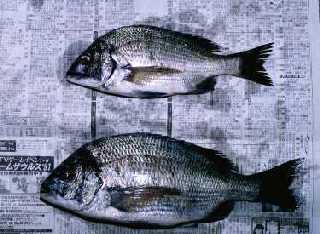 | 初めて釣った年無し (1995年5月) 相差の内筏で釣った49cmと50cmです。 当日もエサトリが多く、フカセ釣りでフグを100尾ほど釣った頃、5cmぐらいの大きな丸貝をつけて3号中通しで放り込んでいた、もう一本の竿の穂先が突然海面に突っ込み、あわてて上げたら大チヌでした。「釣った」じゃなくて「釣れた」ではいかんと、フカセ竿を放り投げ、丸貝を付け再投入。 一時間後、今度はしっかりと大アワセをくれてやり、もう一枚GET!その後、1枚バラシし筏を降りましたが、満面の笑みであったことは言うまでもありません。 (魚拓も少しは見れる様になったか・・(^_^;)) |