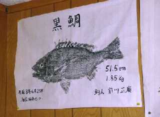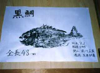 | 初めて釣った40cmオーバー (1992年7月) 相差の沖筏で朝7時に釣れた48cm。 初めて釣った大型のチヌで、その後、スカリのチヌが気になって釣りにならないので12時で筏を降りてしまいました。 「50cmあるかな」と思っていましたが、残念。 帰りに墨と紙を買い込んで魚拓をとりましたが、まるで干物の様です。(^_^;) |